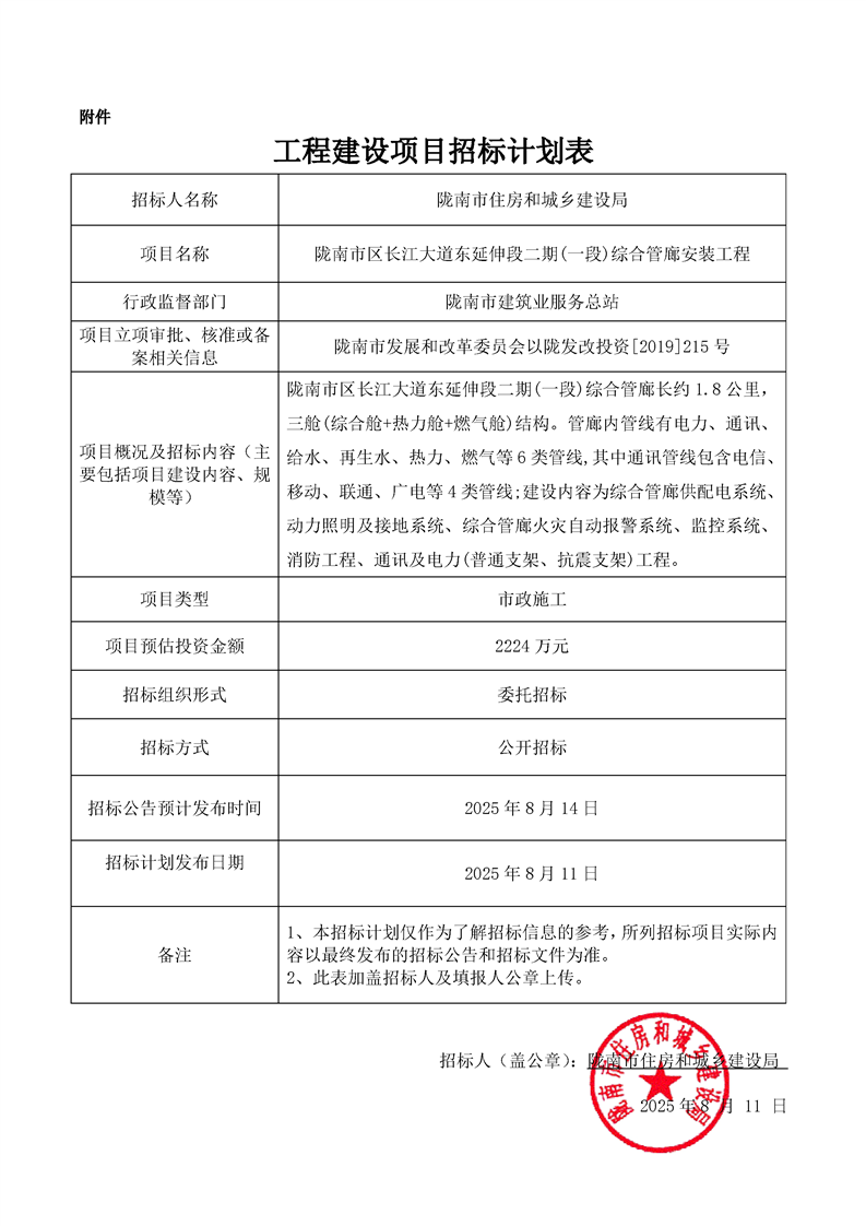 隴南市區(qū)長江大道東延伸段二期(一段)綜合管廊安裝工程工程建設項目招標計劃表.pdf
