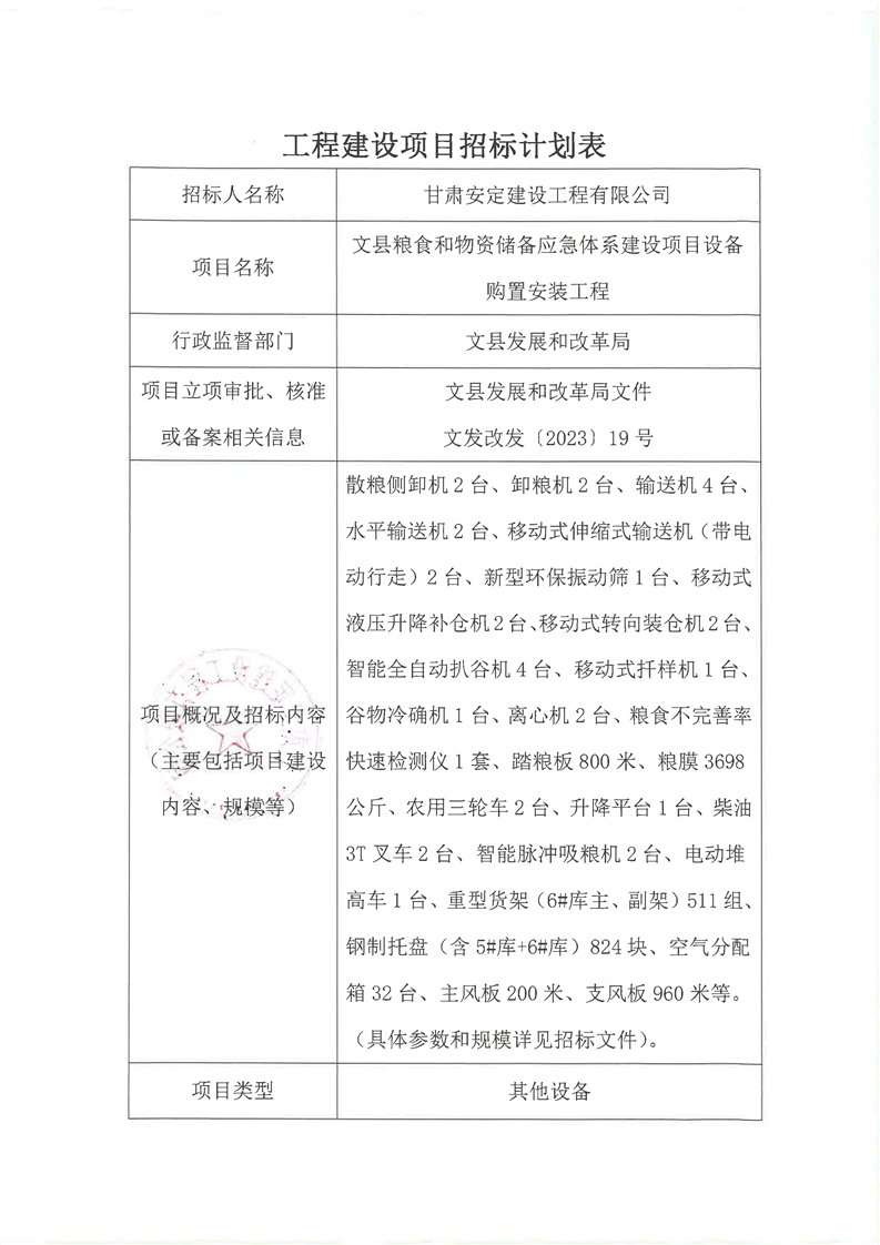 文縣糧食和物資儲備應急體系建設(shè)項目設(shè)備購置安裝工程