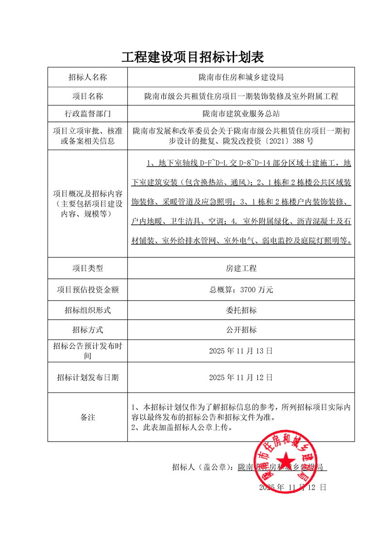 隴南市級公共租賃住房項目一期裝飾裝修及室外附屬工程