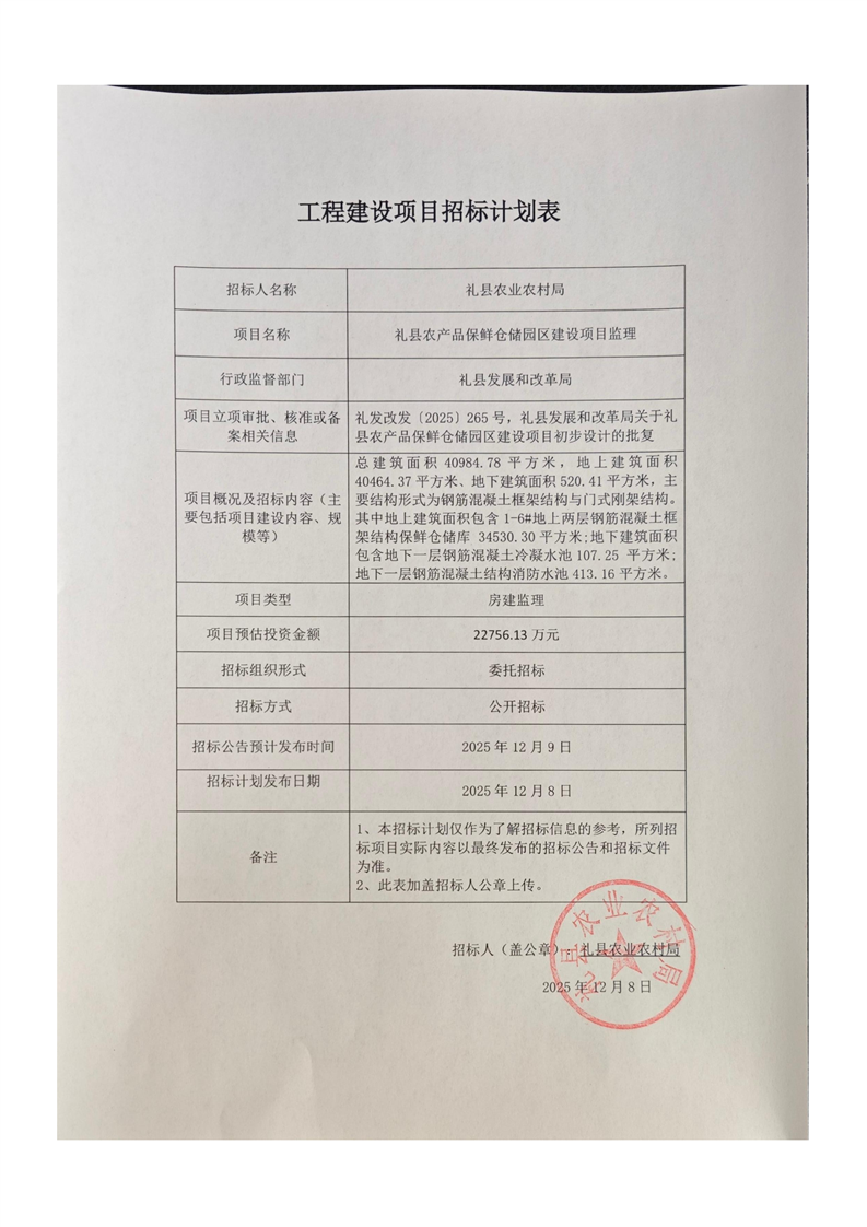 禮縣農(nóng)產(chǎn)品保鮮倉儲園區(qū)建設項目監(jiān)理