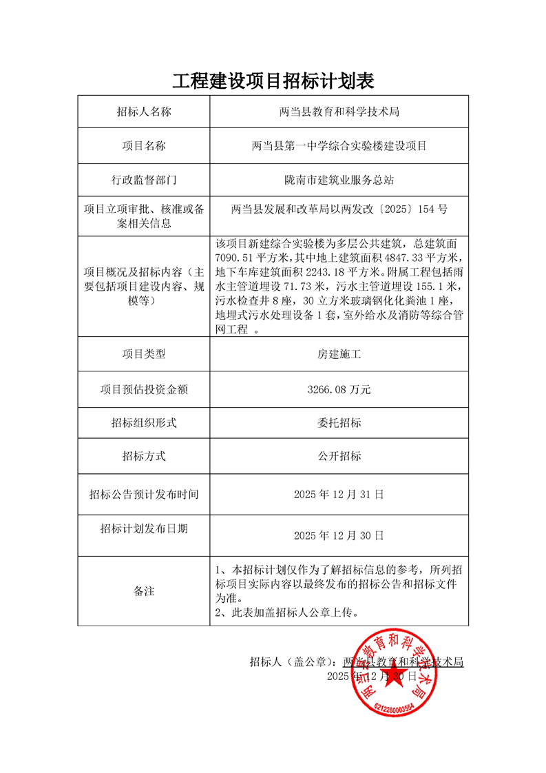兩當(dāng)縣第一中學(xué)綜合實(shí)驗(yàn)樓建設(shè)項(xiàng)目